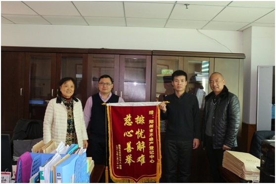 2月27日,鑫苑名家两位老人向郑州市不动产登记中心送上了一面“排忧解难,慈心善举”的锦旗,感谢郑州市不动产登记中心工作人员提供的热情、耐心、真诚而又高效服务。