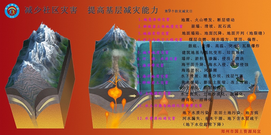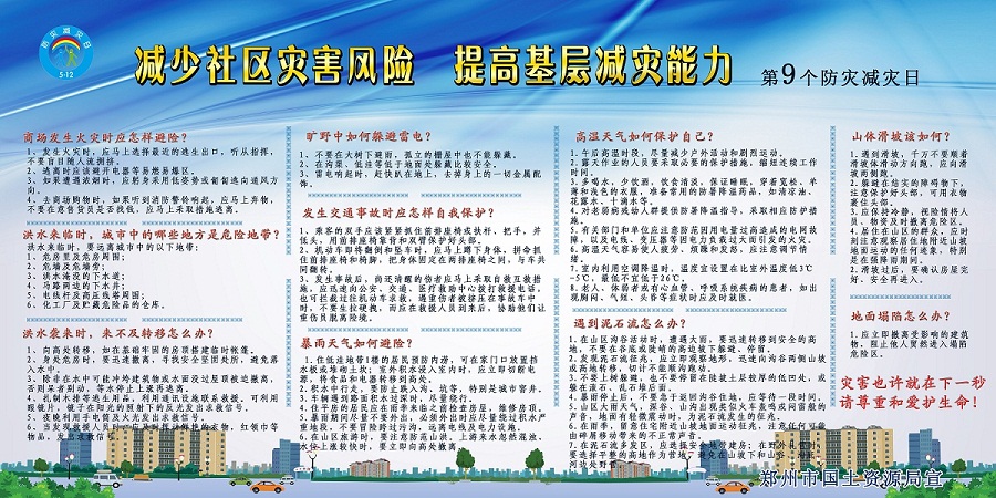 2017年5月12日是我国第9个防灾减灾日,今年的主题是“减少社区灾害风险,提高基层减灾能力”。郑州市国土资源局围绕主题以播放滚动字幕、制作宣传展板、发放宣传资料等方式多方位开展宣传,从对各类灾害的认知及灾害中的紧急避险自救等方面,大力普及灾害影响和防灾减灾常识,旨在提高广大群众防灾减灾意识,努力降低灾害损失。