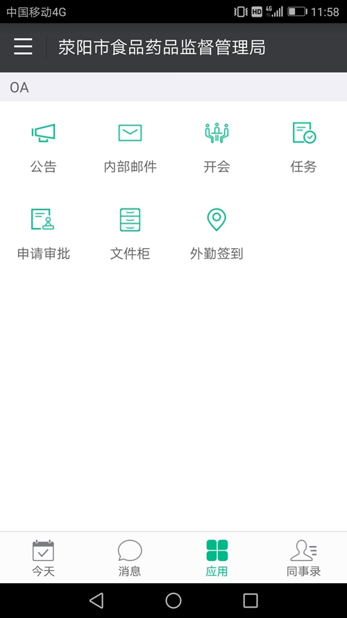 二是“智办公”系统。当前,深化和推广电子政务和网上办公已成为机关工作的发展趋势,各级政府机关都在探索“互联网+政务”的有效开展方式。相较于常见的机关政务办公内网,荥阳市食药局启用的“智办公”系统可由电脑端和手机端同时进行操作,功能更加完善多样,操作更加方便快捷。“智办公”系统主要由公告、内部邮件、开会、任务、申请审批、文件柜、外勤签到7个模块构成,具备通知、文件、任务的下达,请假、用车、用章、办公用品领取、固定资产购置和领用的申请审批,资料共享等功能,并能及时进行消息推送,避免工作遗漏,为实现无纸化办公提供了平台支撑