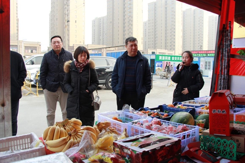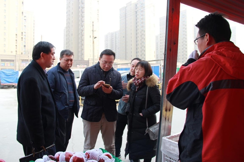 1月17日下午,河南省食药监局食品流通监管处副处长宋倩、科长刘尚辰,郑州市食药监局食品流通监管处处长王德贤一行到惠济区毛庄农产品批发市场验收流通环节食品安全管理示范单位工作,并对“溯本通”电子追溯系统进行实地调研。惠济区食药监局副局长弓宏伟陪同。