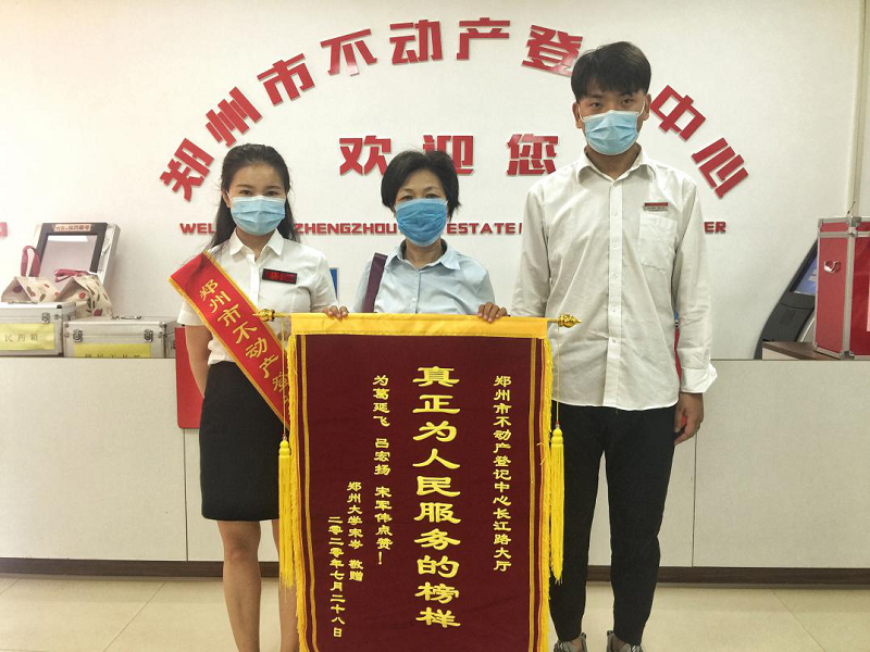 2020年8月上旬,吴女士来到郑州市不动产登记中心长江路服务大厅,将一面写有“真正为人民服务的榜样”锦旗送到工作人员手中,对大厅工作人员主动作为、心系百姓、热情服务表示感谢。