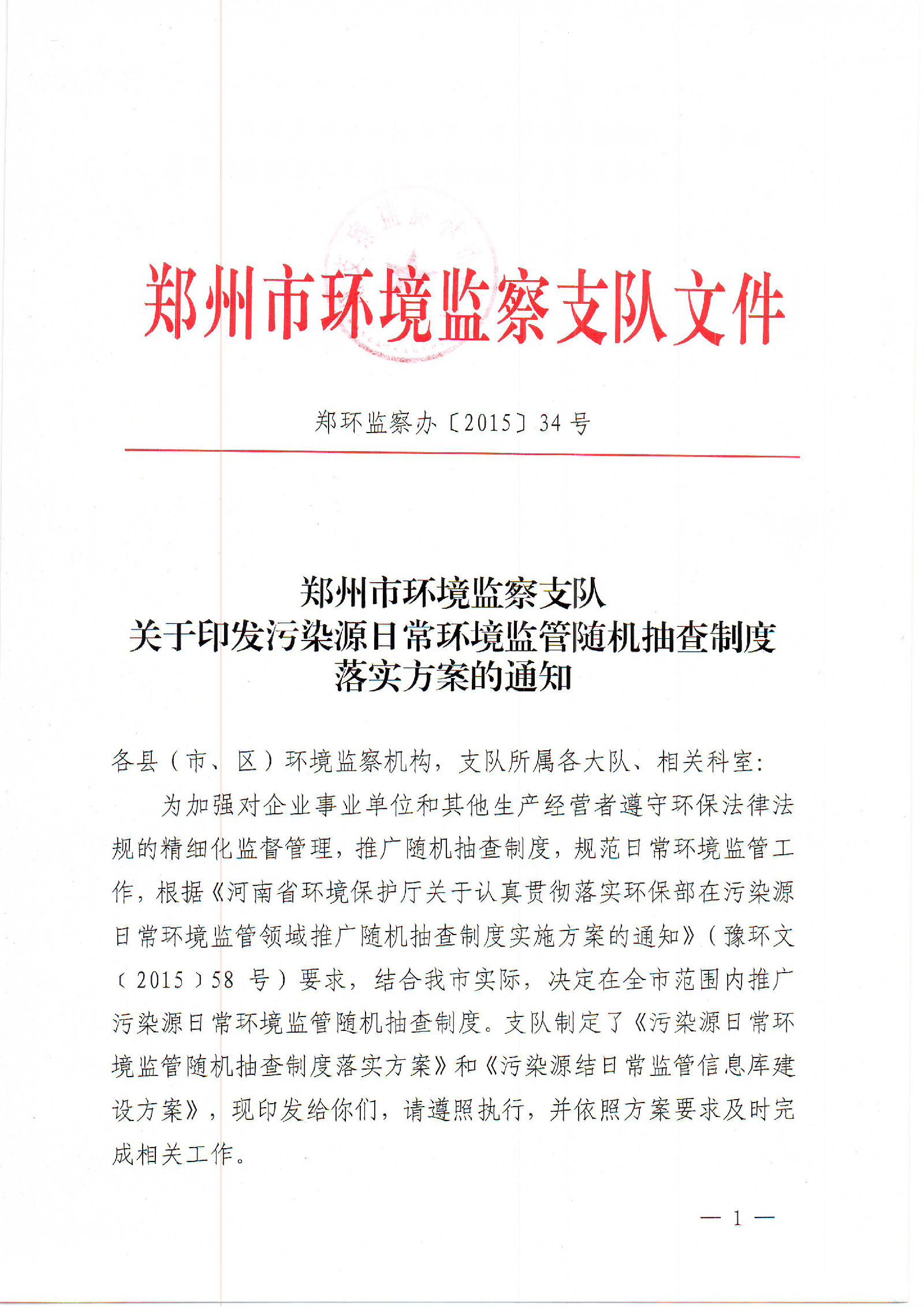 郑州市污染源日常环境监管随机抽查制度落实方案