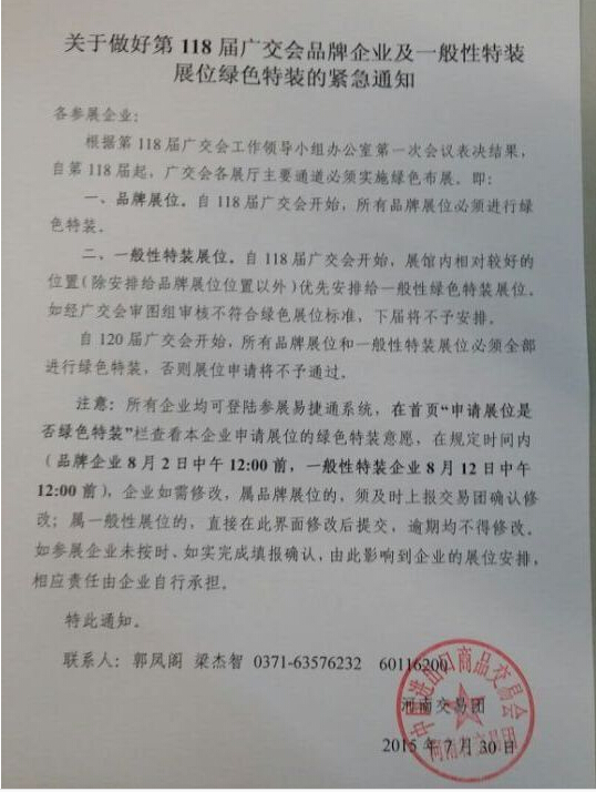 关于做好118届广交会品牌企业及一般性特装展位绿色特装的紧急通知