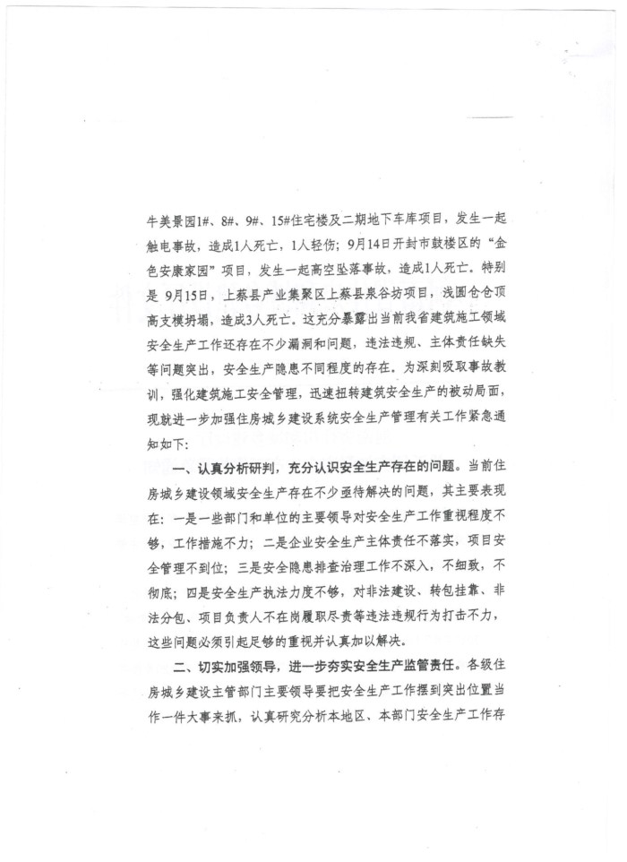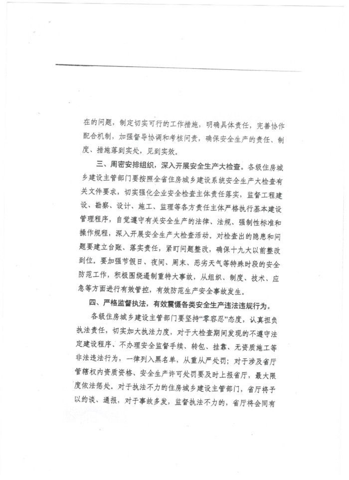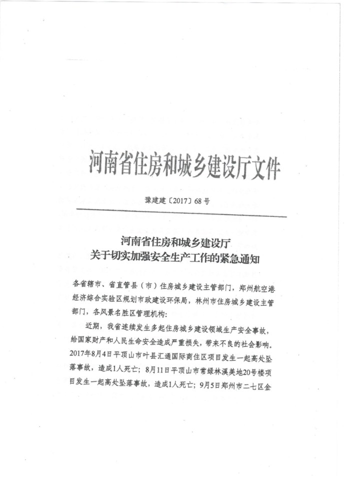 为全面贯彻全省住房城乡建设系统安全生产大检查有关要求,有效防范生产安全事故发生,现将《河南省住房和城乡建设厅关于切实加强安全生产工作的紧急通知》(豫建建〔2017〕68号)转发你们,请认真组织学习,深刻汲取教训,举一反三,深入开展安全生产大检查,认真排查治理隐患,坚决遏制重特大事故,确保 “十九大”召开期间全市建筑施工领域安全生产形势稳定。