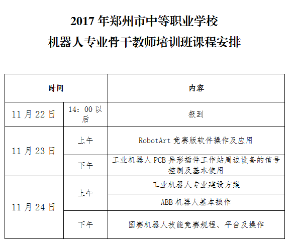 为了促进我市中等职业学校工业机器人应用方向教科研水平提升,主动适应工业机器人产业发展,进一步完善工业机器人技术及其相关专业的课程体系建设,促进我市工业机器人应用水平整体提升。经研究决定举办工业机器人应用方向骨干教师培训班,现将有关事宜通知如下: