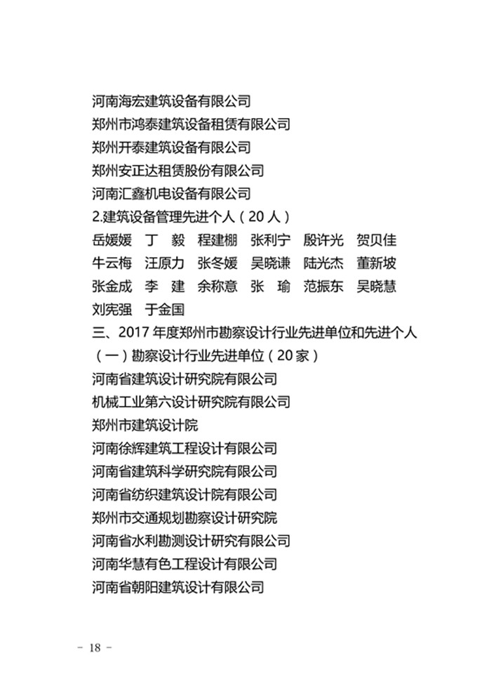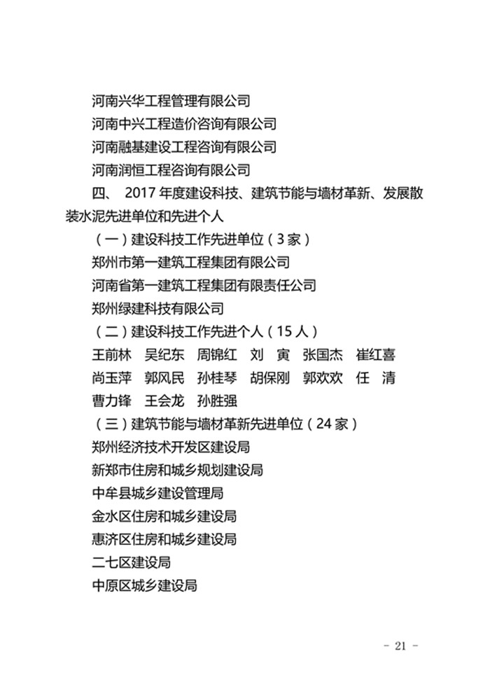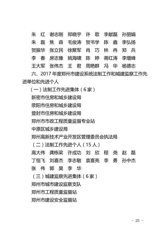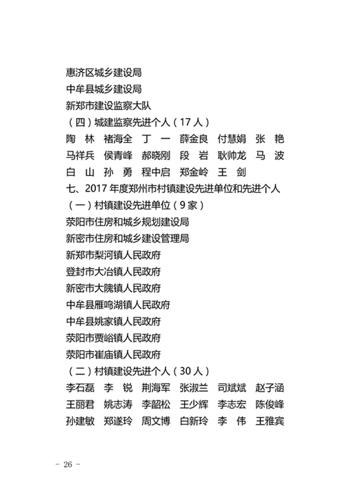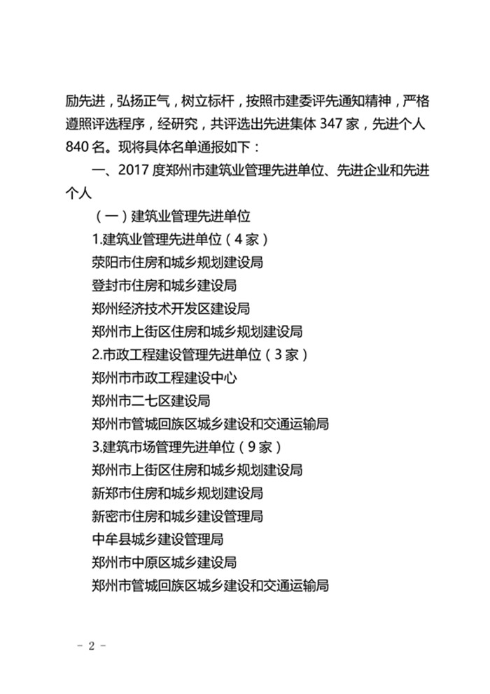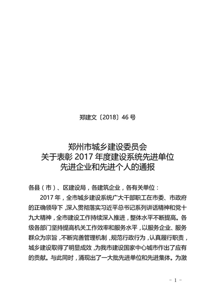 郑州市城乡建设委员会关于表彰2017年度建设系统先进单位先进企业和先进个人的通报