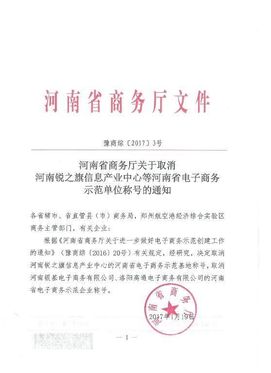 河南省商务厅关于取消河南锐之旗信息产业中心等河南省电子商务示范单位称号的通知