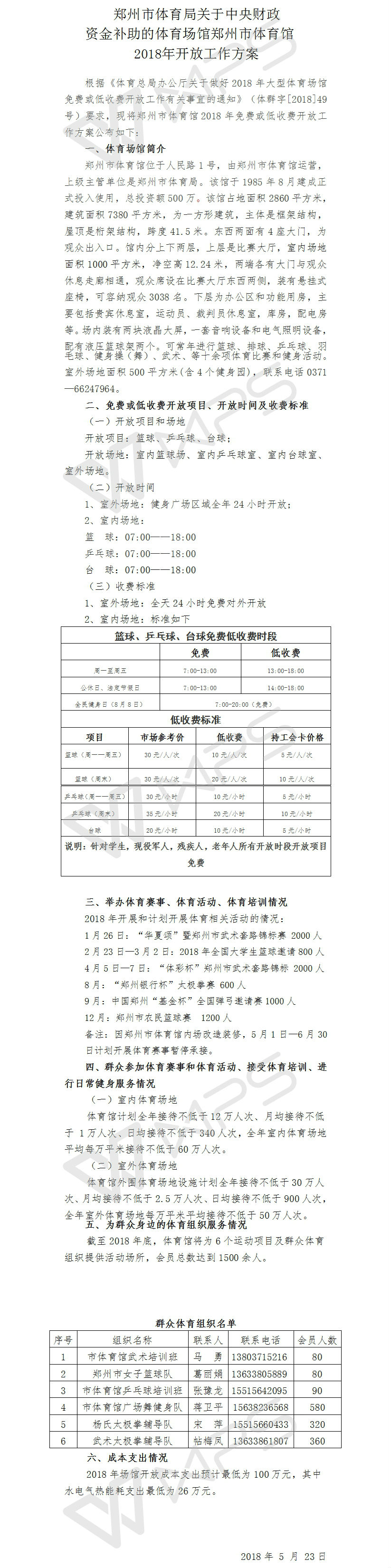 郑州市体育局关于中央财政资金补助的体育场馆郑州市体育馆2018年开放工作方案