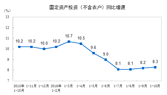 2016年1-10月份,全国固定资产投资(不含农户)484429亿元,同比名义增长8.3%,增速比1-9月份加快0.1个百分点。从环比速度看,10月份固定资产投资(不含农户)增长0.58%。