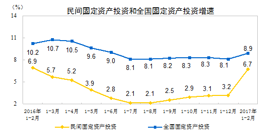2017年1-2月份,民间固定资产投资24977亿元,同比名义增长6.7%,增速比去年全年提高3.5个百分点;民间固定资产投资占全国固定资产投资(不含农户)的比重为60.4%。