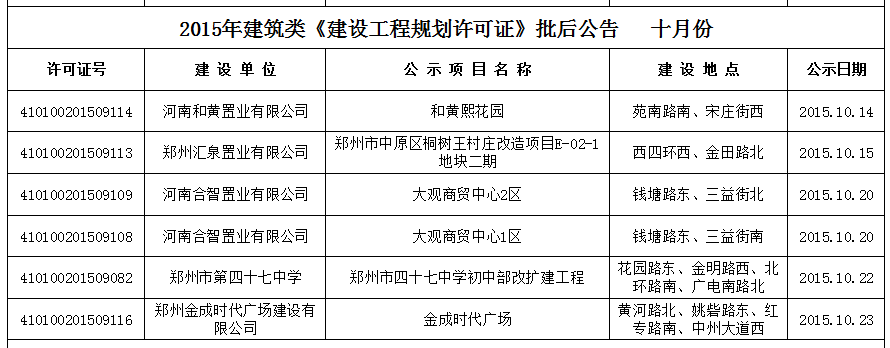 2015年建筑类《建设工程规划许可证》批后公告 十月份