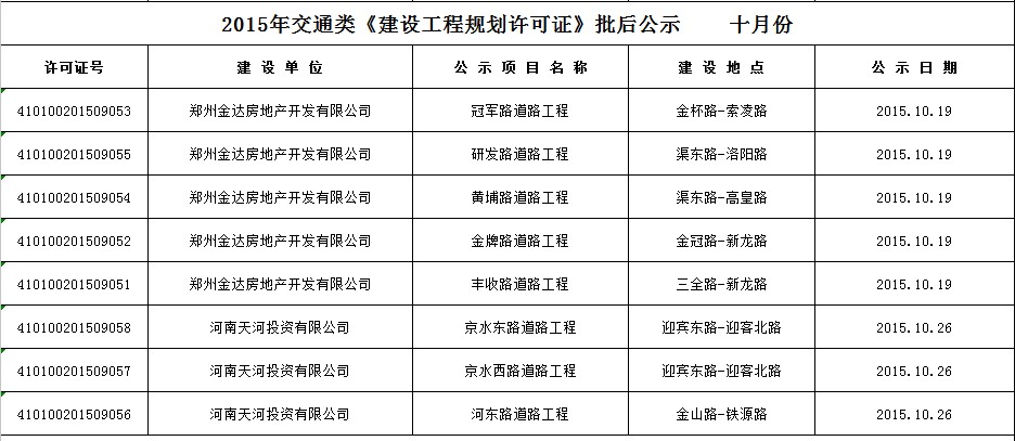 2015年交通类《建设工程规划许可证》批后公示 十月份