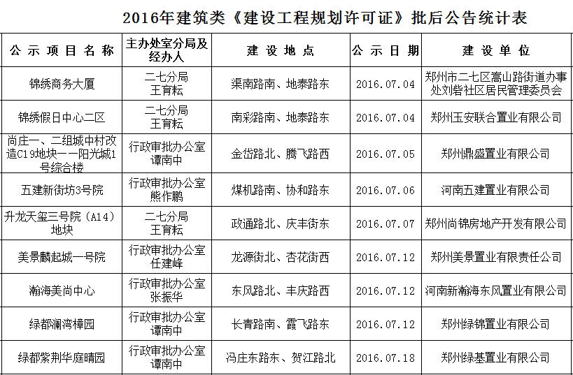 2016年建筑类《建设工程规划许可证》批后公告 七月份(上旬)