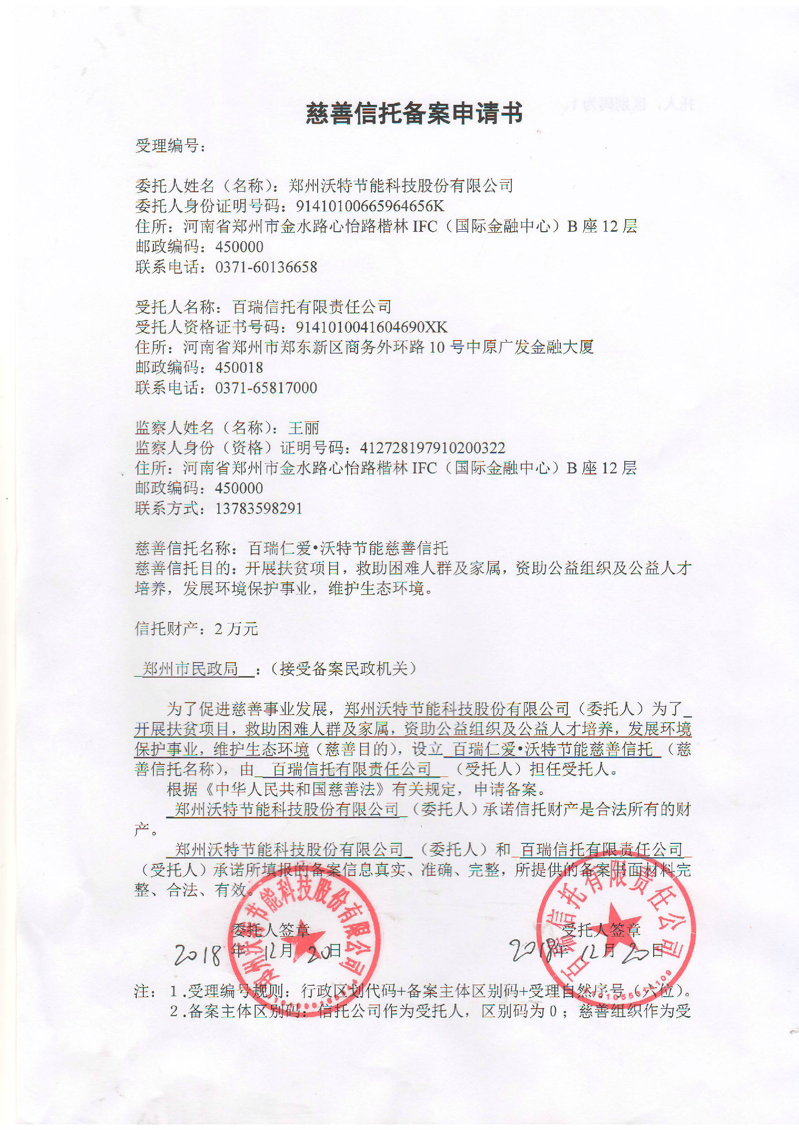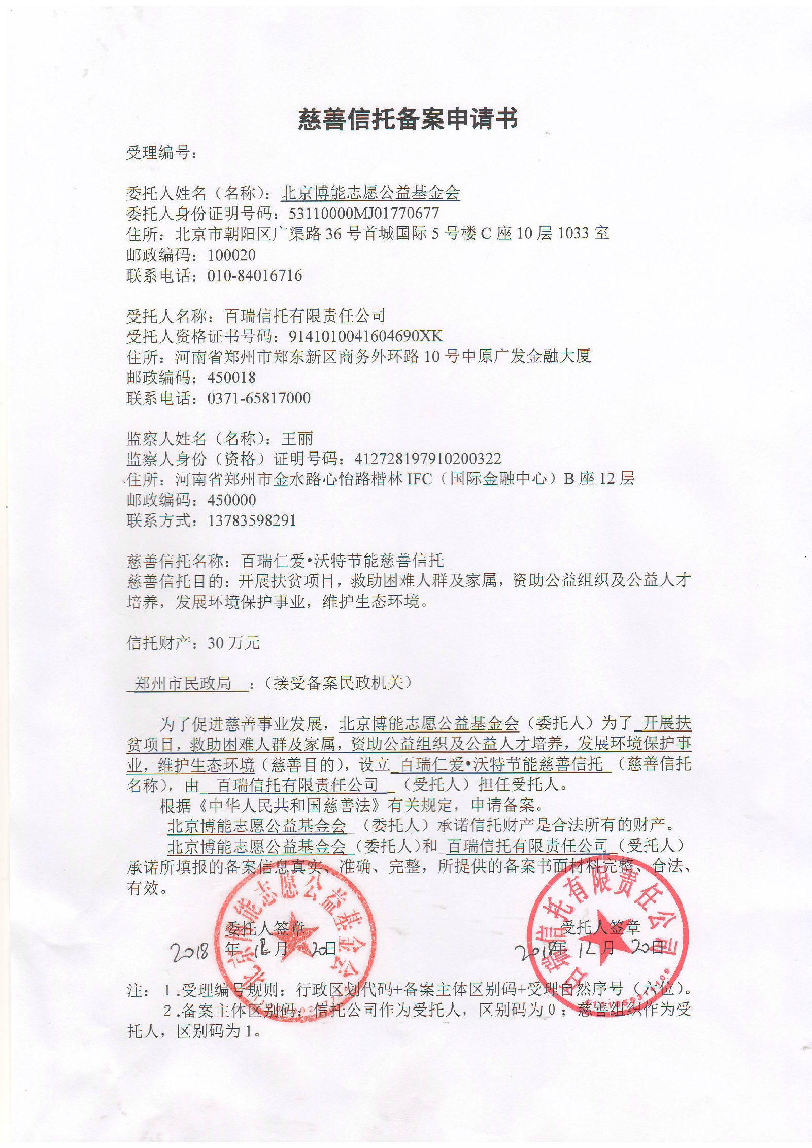 附件:“百瑞仁爱·沃特节能慈善信托”备案申请书
