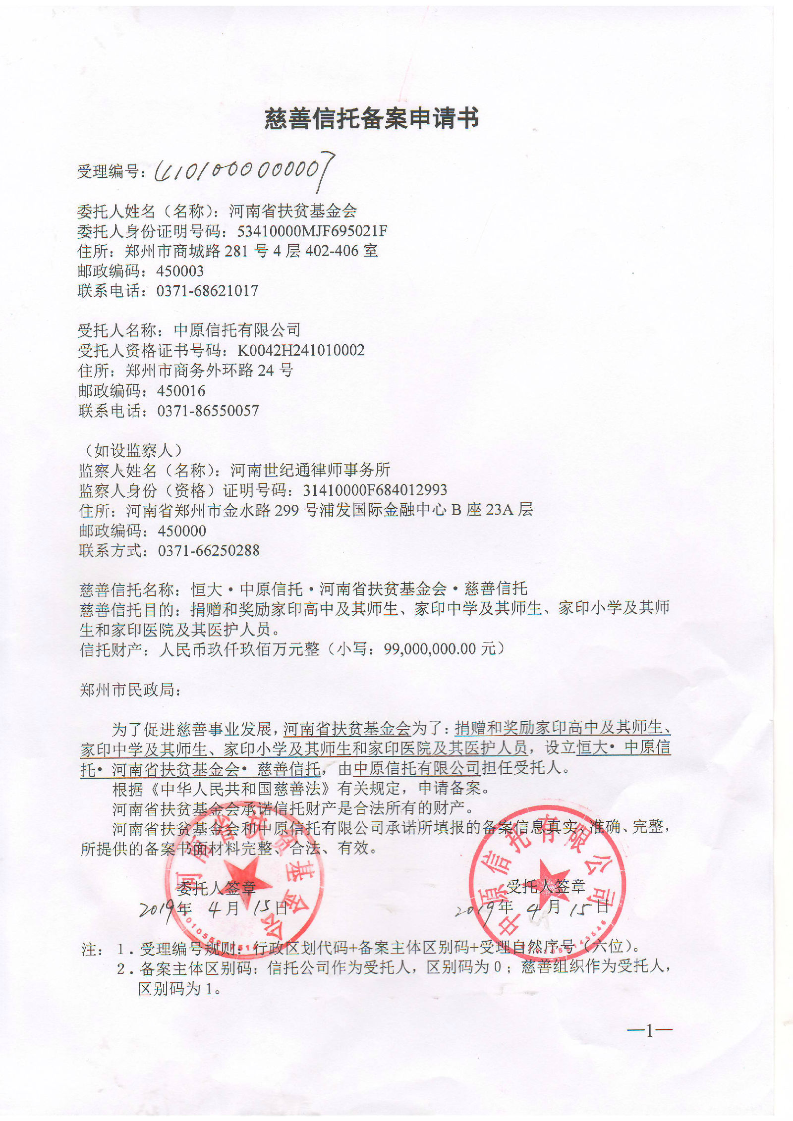 附件:“恒大·中原信托·河南省扶贫基金会·慈善信托”备案申请书
