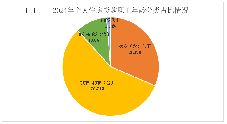 贷款职工中,30岁(含)以下占31.35%,30岁-40岁(含)占56.71%,40岁-50岁(含)占10.6%,50岁以上占1.34%;购买首套住房申请贷款占88.01%,购买二套及以上申请贷款占11.99%;中、低收入占98.11%,高收入占1.89%。