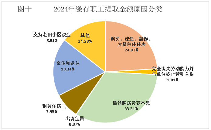 提取金额中,购买、建造、翻建、大修自住住房占24.03%,偿还购房贷款本息占33.51%,租赁住房占7.95%,支持老旧小区改造占0.01%,离休和退休提取占18.34%,完全丧失劳动能力并与单位终止劳动关系提取占1.81%,出境定居占0.07%,其他占14.28%。提取职工中,中、低收入占97.32%,高收入占2.68%。