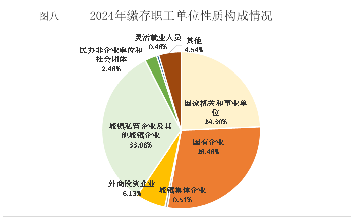 缴存职工中,国家机关和事业单位占24.3%,国有企业占28.48%,城镇集体企业占0.51%,外商投资企业占6.13%,城镇私营企业及其他城镇企业占33.08%,民办非企业单位和社会团体占2.48%,灵活就业人员占0.48%,其他占4.54%;中、低收入占97.44%,高收入占2.56%。