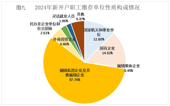 新开户职工中,国家机关和事业单位占12.6%,国有企业占14.52%,城镇集体企业占0.45%,外商投资企业占4.86%,城镇私营企业及其他城镇企业占57.74%,民办非企业单位和社会团体占2.51%,灵活就业人员占1.95%,其他占5.37%;中、低收入占99.44%,高收入占0.56%。