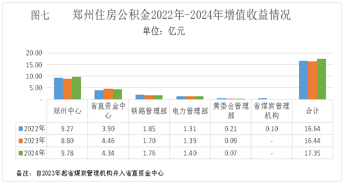 2024年,增值收益173469.85万元,同比增长5.54%。其中,郑州中心97757.86万元,省直资金中心43422.46万元,铁路管理部17564.02万元,省电力管理部13969.43万元,黄委会管理部756.08万元;增值收益率1.35%,比上年减少0.03个百分点。