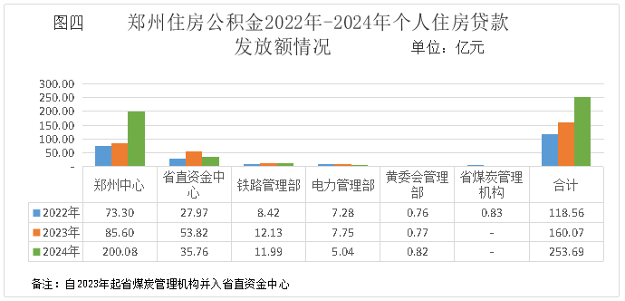 2024年,发放个人住房贷款3.99万笔、253.69亿元,同比分别增长51.02%、58.49%。其中,郑州中心发放个人住房贷款3.25万笔、200.08亿元,省直资金中心发放个人住房贷款0.47万笔、35.76亿元,铁路管理部发放个人住房贷款0.18万笔、11.99亿元,省电力管理部发放个人住房贷款0.08万笔、5.04亿元,黄委会管理部发放个人住房贷款0.01万笔、0.82亿元。