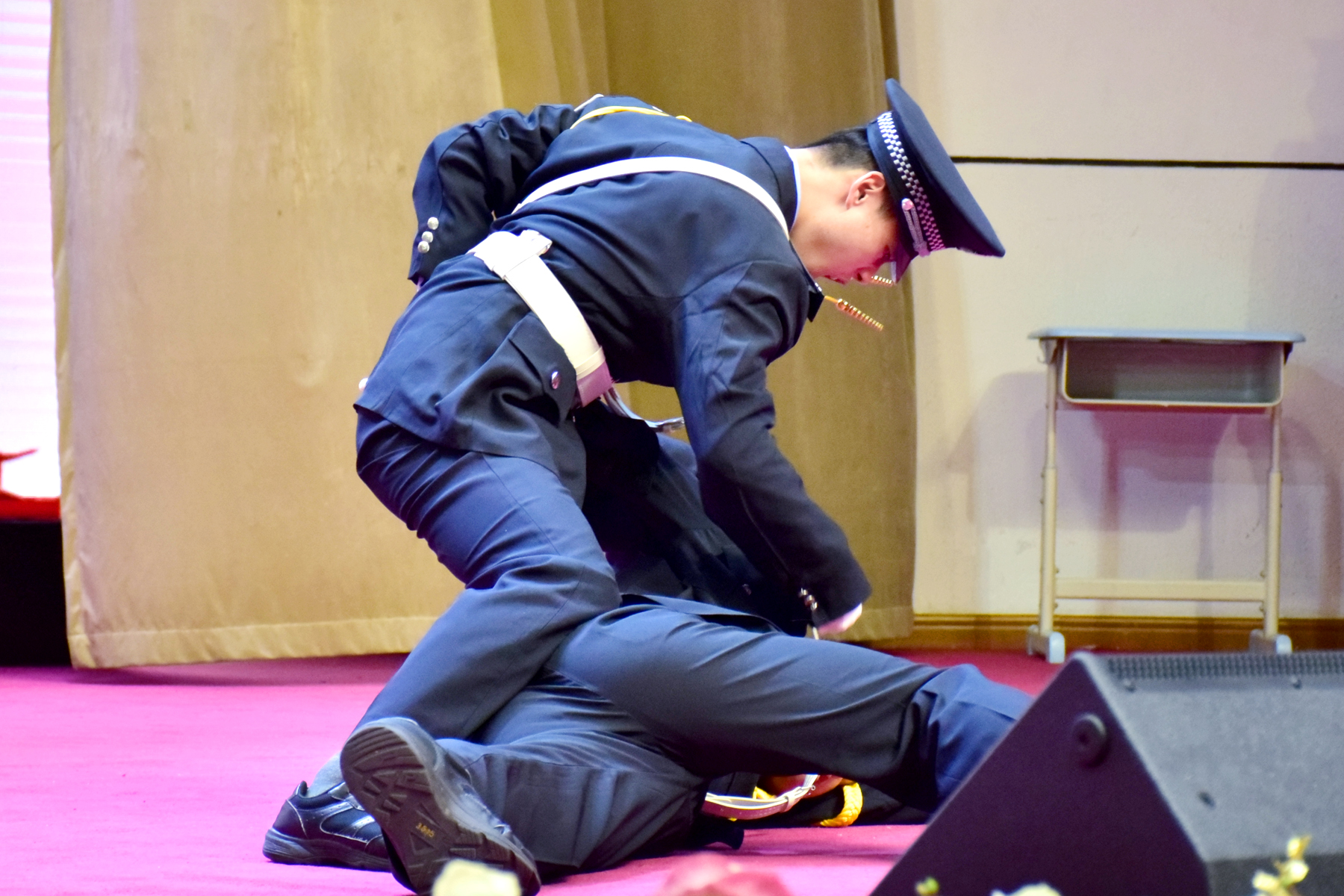 在郑州47中综治办主任蔡海友的指挥下,该校安保人员为全体与会人员展示了基本素养训练、反恐防暴应急处置和电器起火应急处置三个模块的演练。在演练的过程中,郑州47中安保人员动作规范、本领过硬、技能娴熟、精神饱满,也充分展示了他们忠诚担当的政治品格、顽强拼搏的坚强意志和精湛扎实的实战技能。
