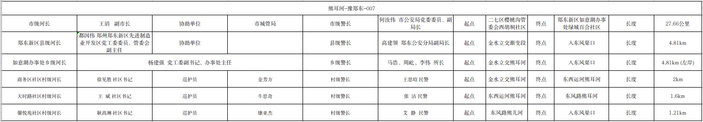 关于熊耳河郑东新区如意湖办事处段河长、警长名单的公示(熊耳河-豫郑东-007)