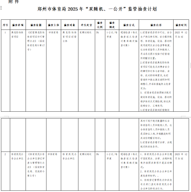 附件:郑州市体育局2025年“双随机 、一公开”监管抽查计划