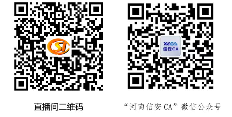 参保单位手机微信扫描二维码即可直接进入直播课堂,亦可通过PC打开直播间链接(https://appiie3yabl3989.h5.xiaoeknow.com/p/decorate/homepage);关注“河南信安CA”微信公众号可主动预约开播提醒,预约成功后将自动推送提醒开播消息(直播间及“河南信安CA”微信公众号二维码附后)。