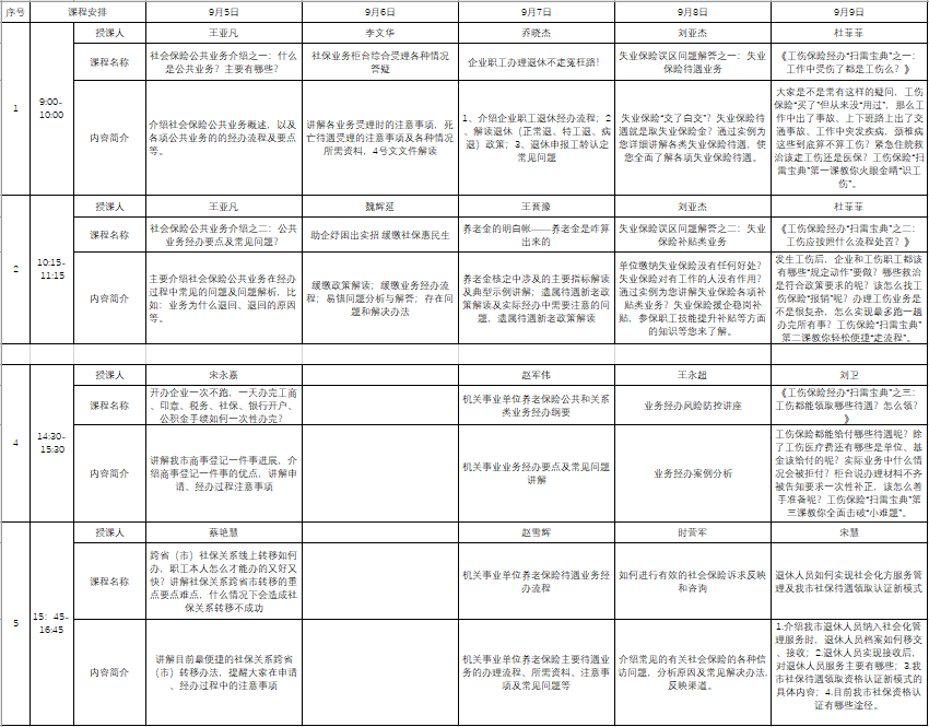 讲解社会保险公共业务、社保关系转移接续、养老保险待遇、工伤保险待遇、失业保险待遇相关知识及近期社保热点问题。每期课程详细安排通过郑州市社会保险中心官网、“河南信安CA”微信公众号等渠道提前发布。