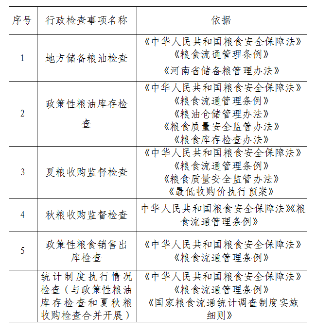 郑州市粮食和物资储备局涉企行政检查事项和依据