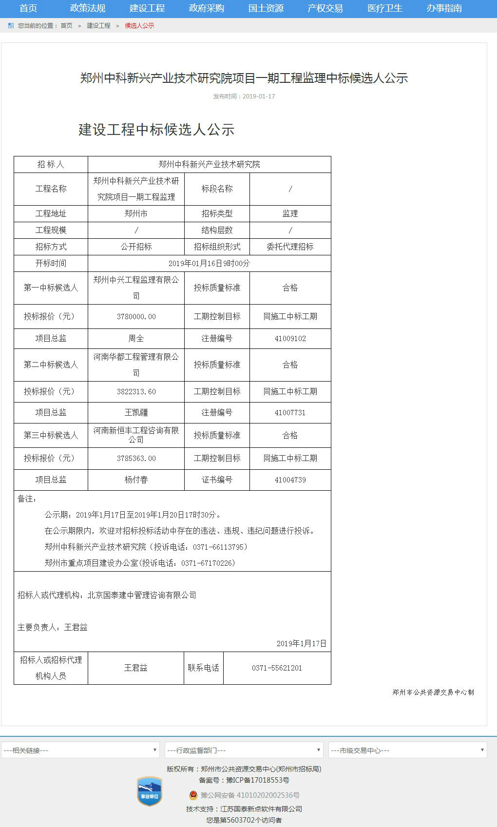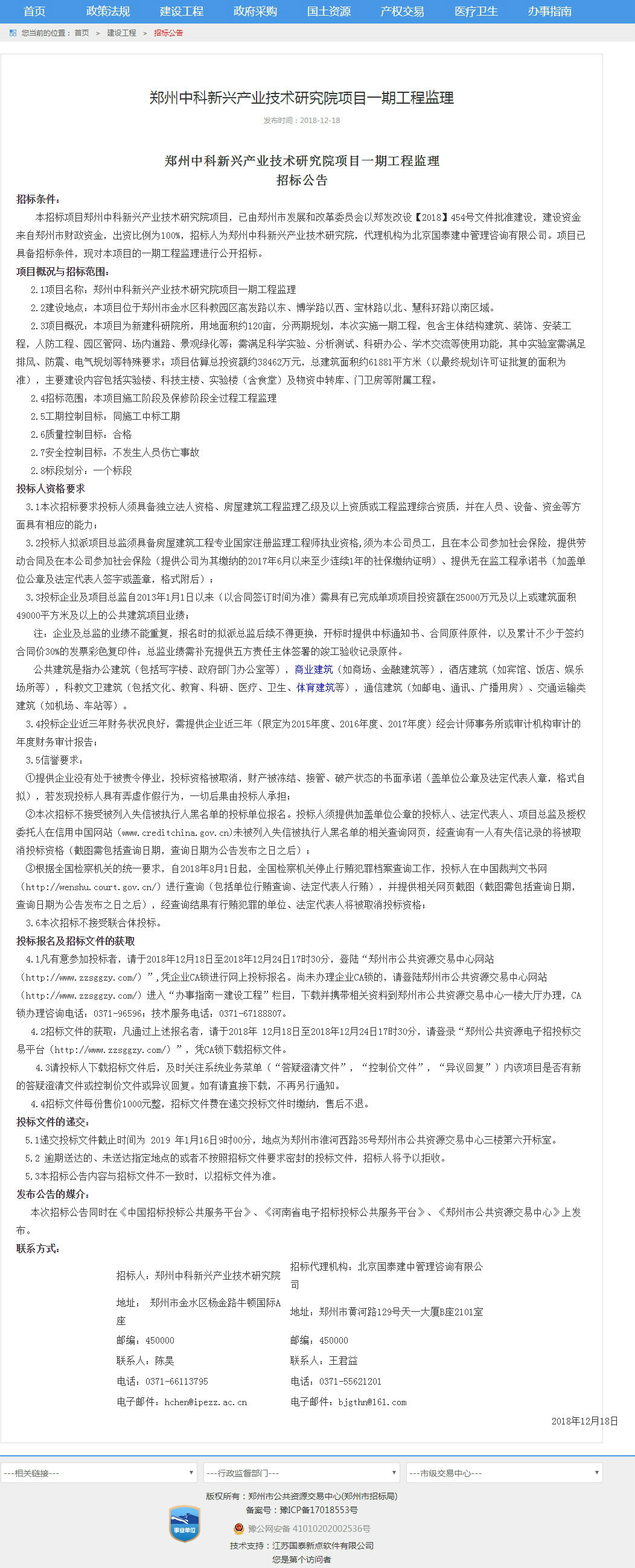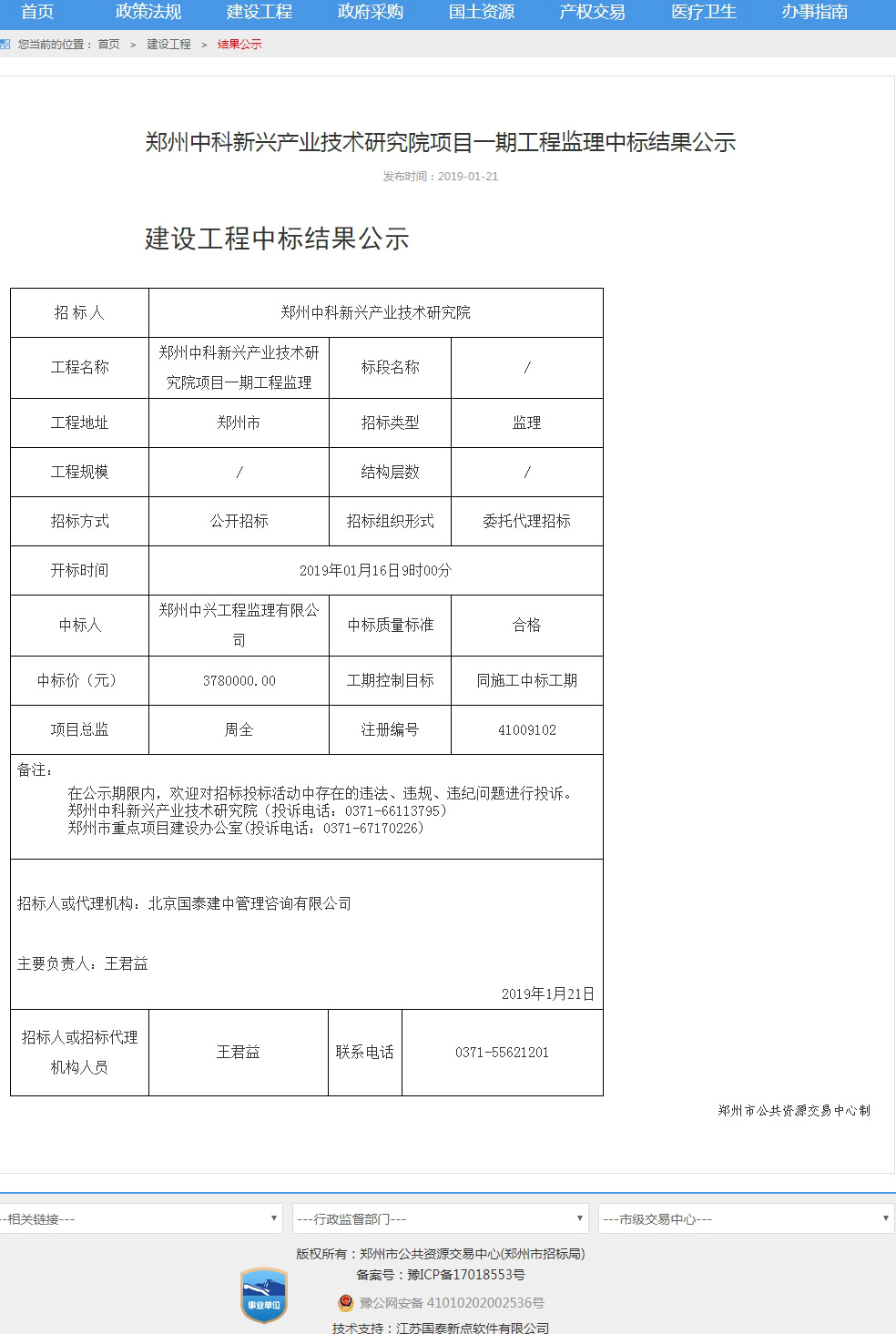 郑州中科新兴产业技术研究院项目一期工程监理招标投标信息