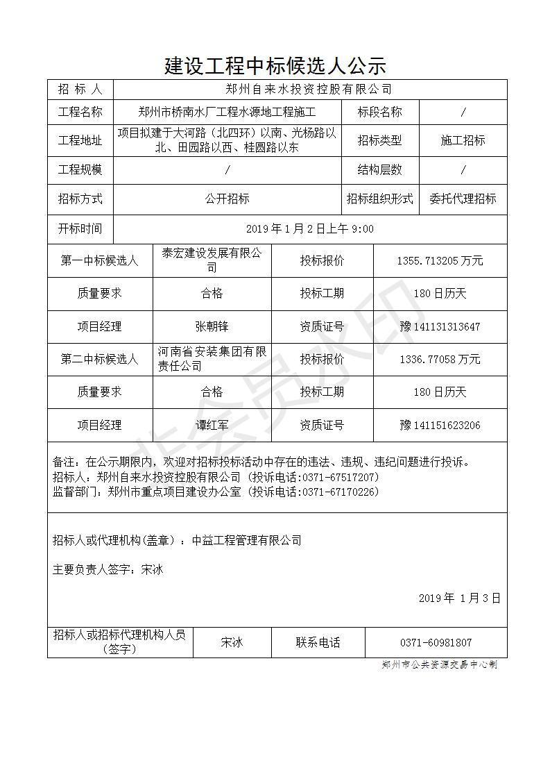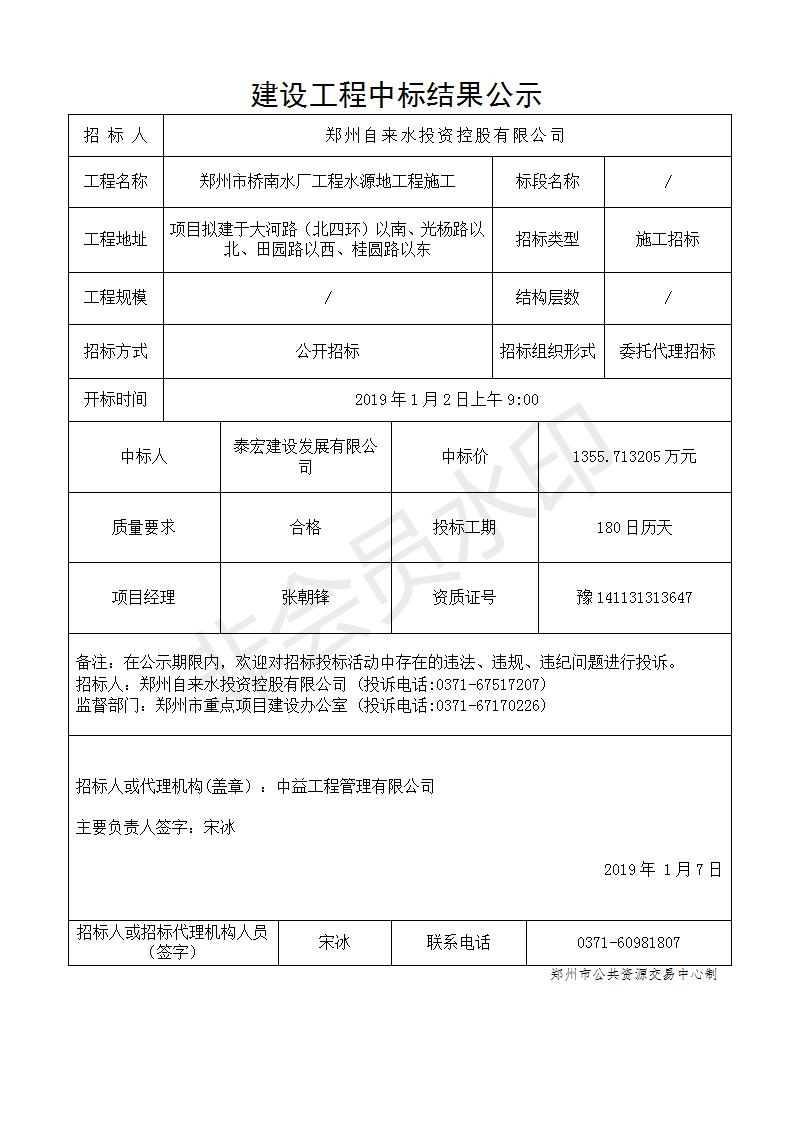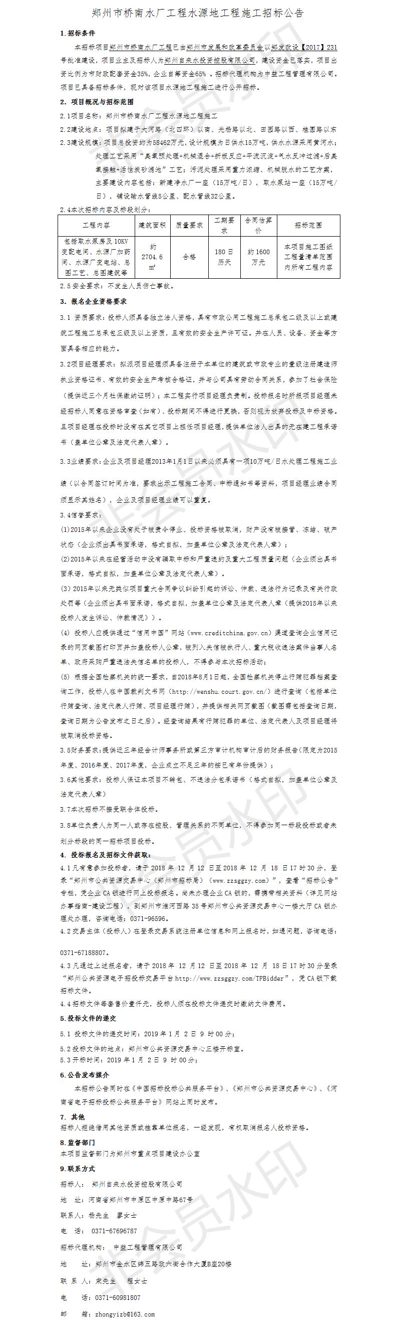 郑州市桥南水厂工程水源地工程施工招标投标信息