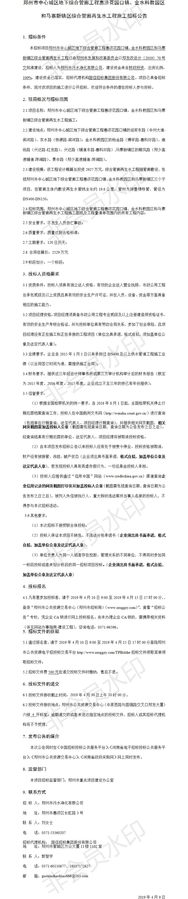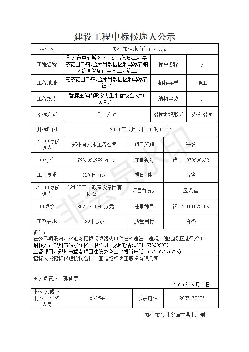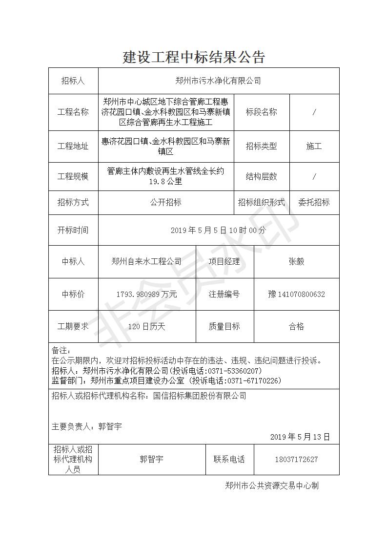 郑州市中心城区地下综合管廊工程惠济花园口镇、金水科教园区和马寨新镇区综合管廊再生水工程施工